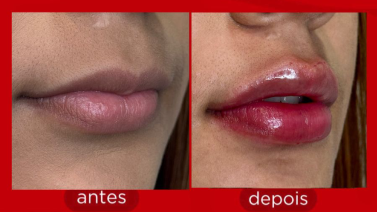 Antes / Após Preenchimento Labial (1 ml) Volume sutil, contorno definido e proporção preservada.